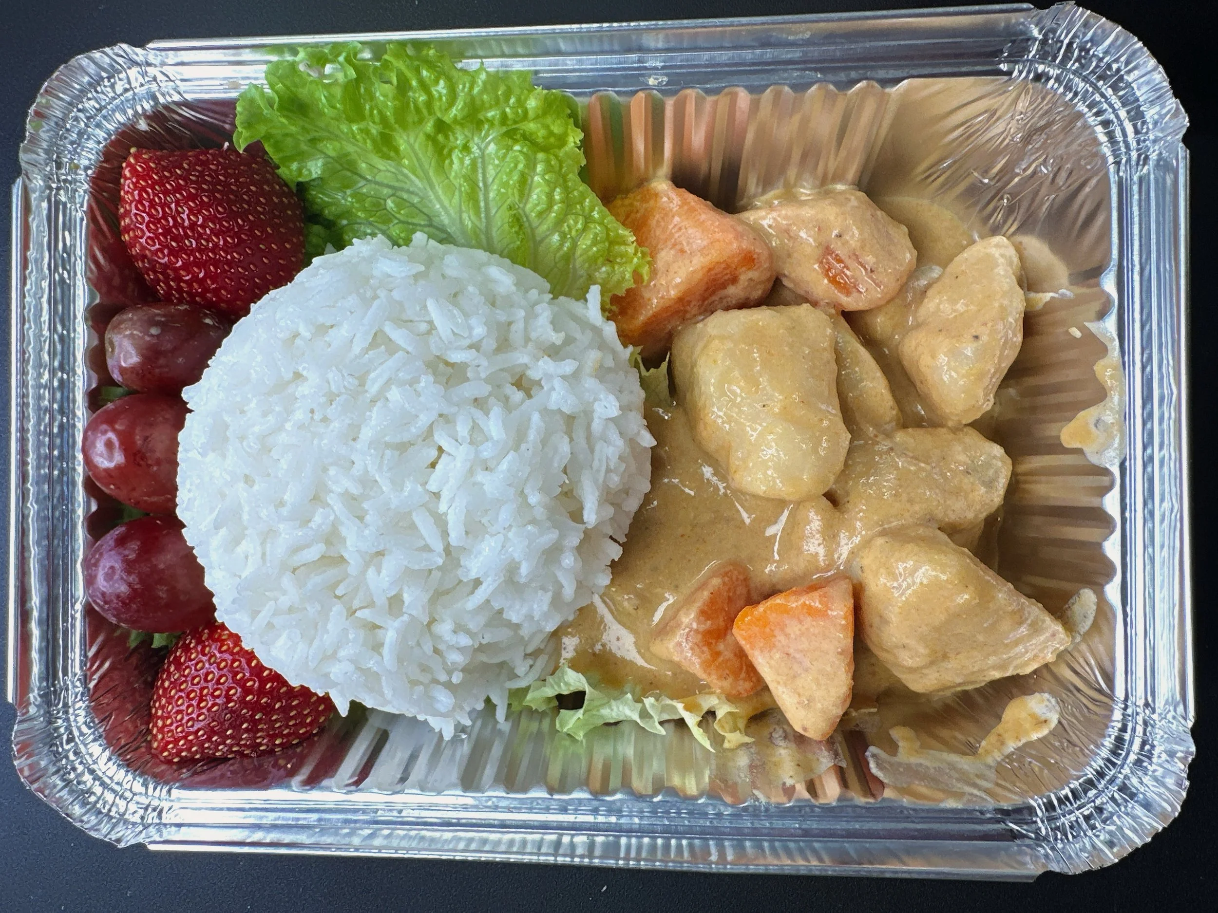 Massaman Curry with tender chicken (or tempeh for a vegetarian option) simmered in a coconut milk broth with spices like cumin, cardamom, and cinnamon, served with jasmine rice.