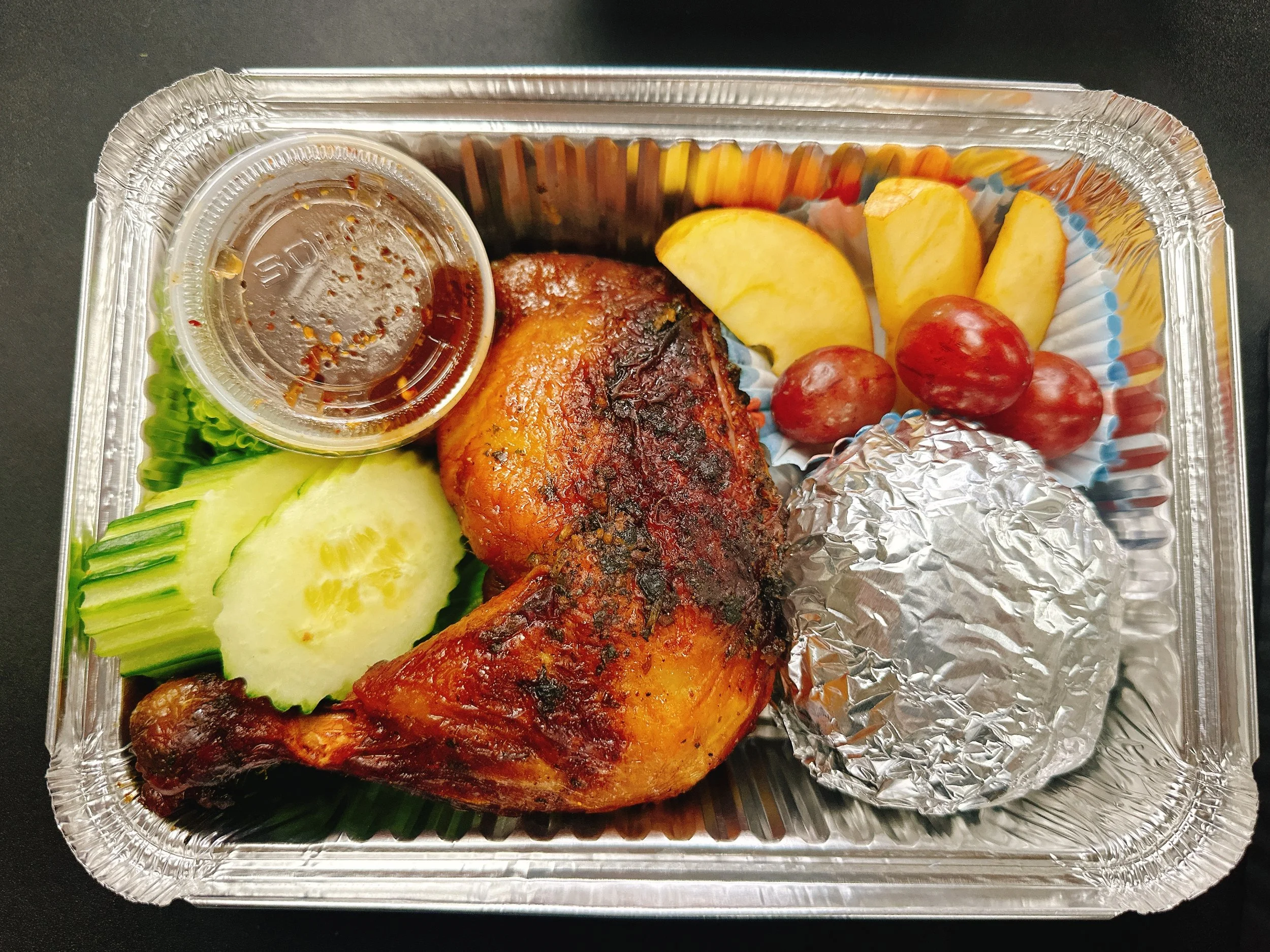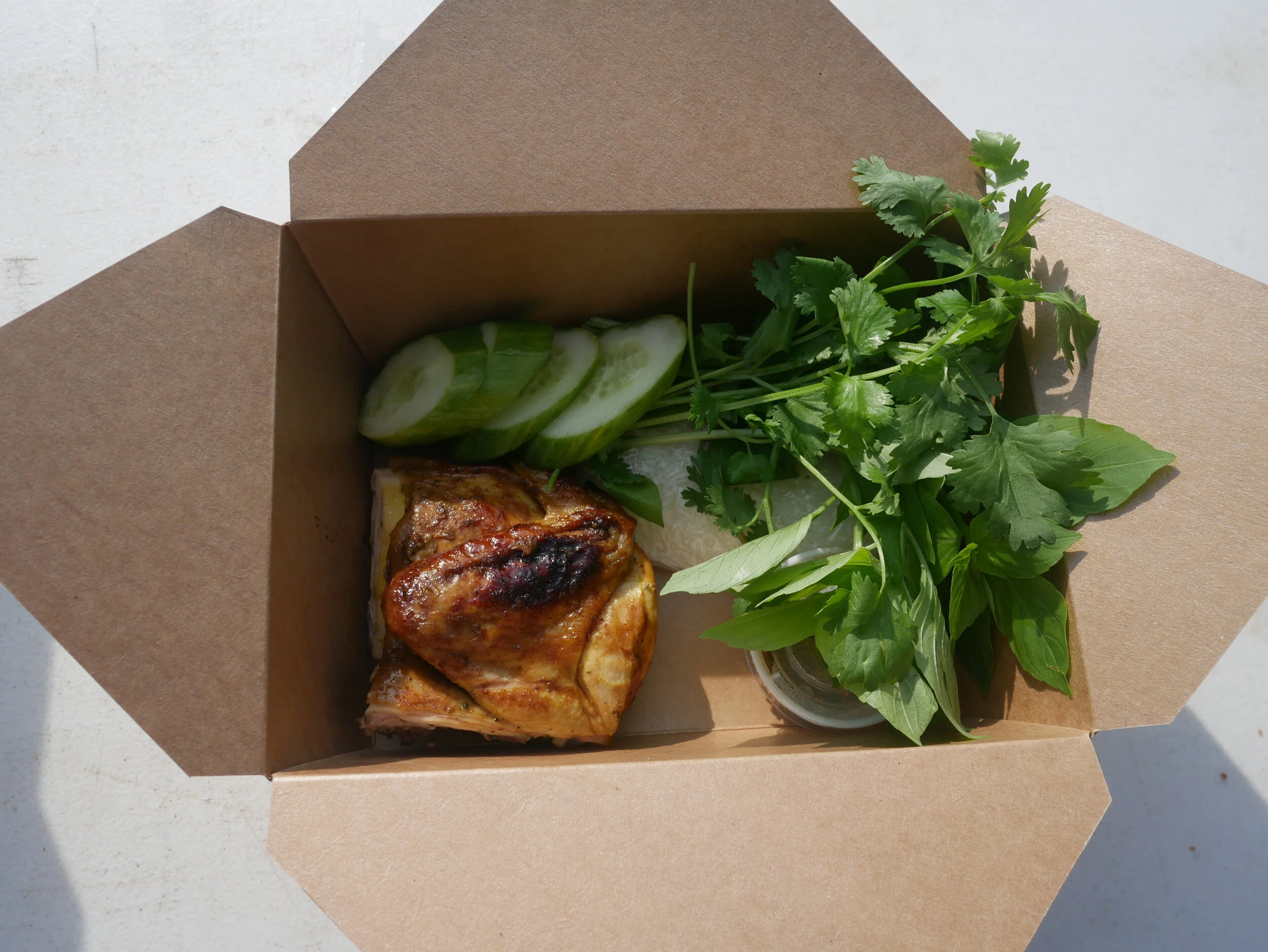 Gai Yang features Thai grilled chicken marinated in garlic, cilantro, black pepper, and a mix of sauces, served with sticky rice, cucumber, cabbage, and a tangy sauce.