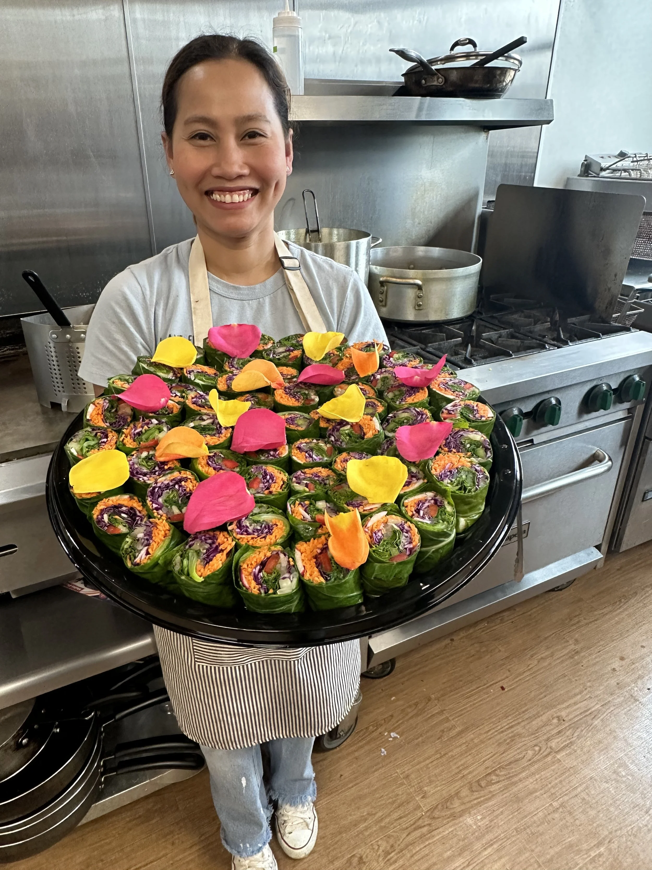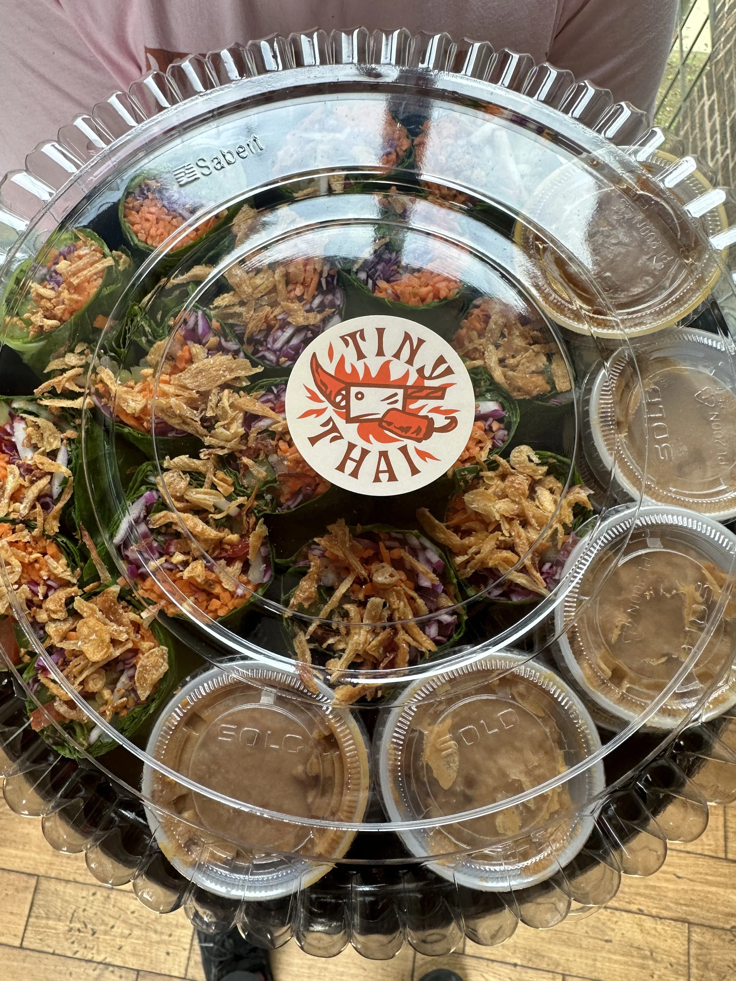Fresh veggies wrapped in leafy greens, served with Thai peanut sauce and topped with crunchy fried onions.