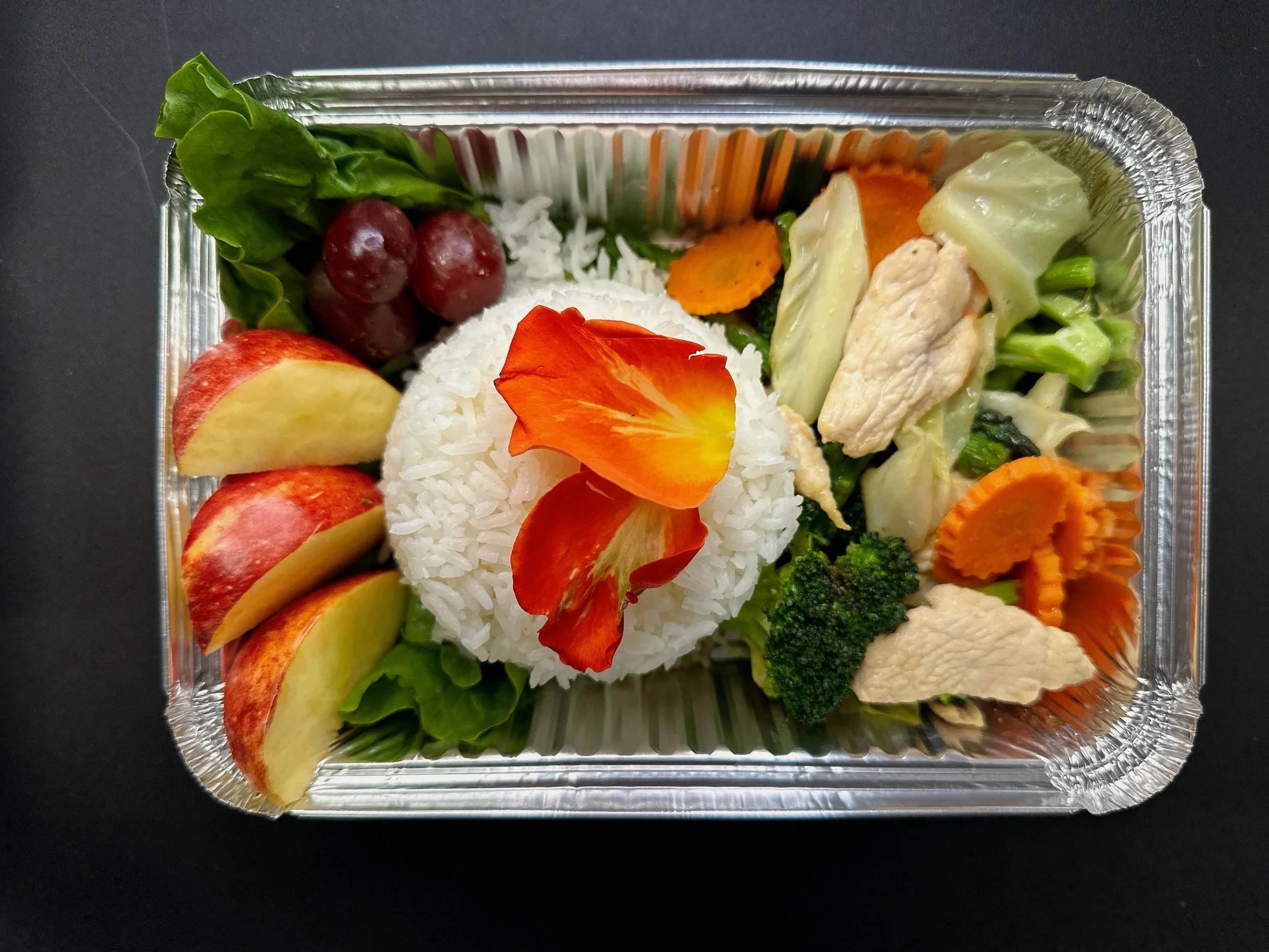 Pad Ka Pow stir-fry with your choice of protein, garlic, onion, Thai basil, and customizable spice levels, served over rice.